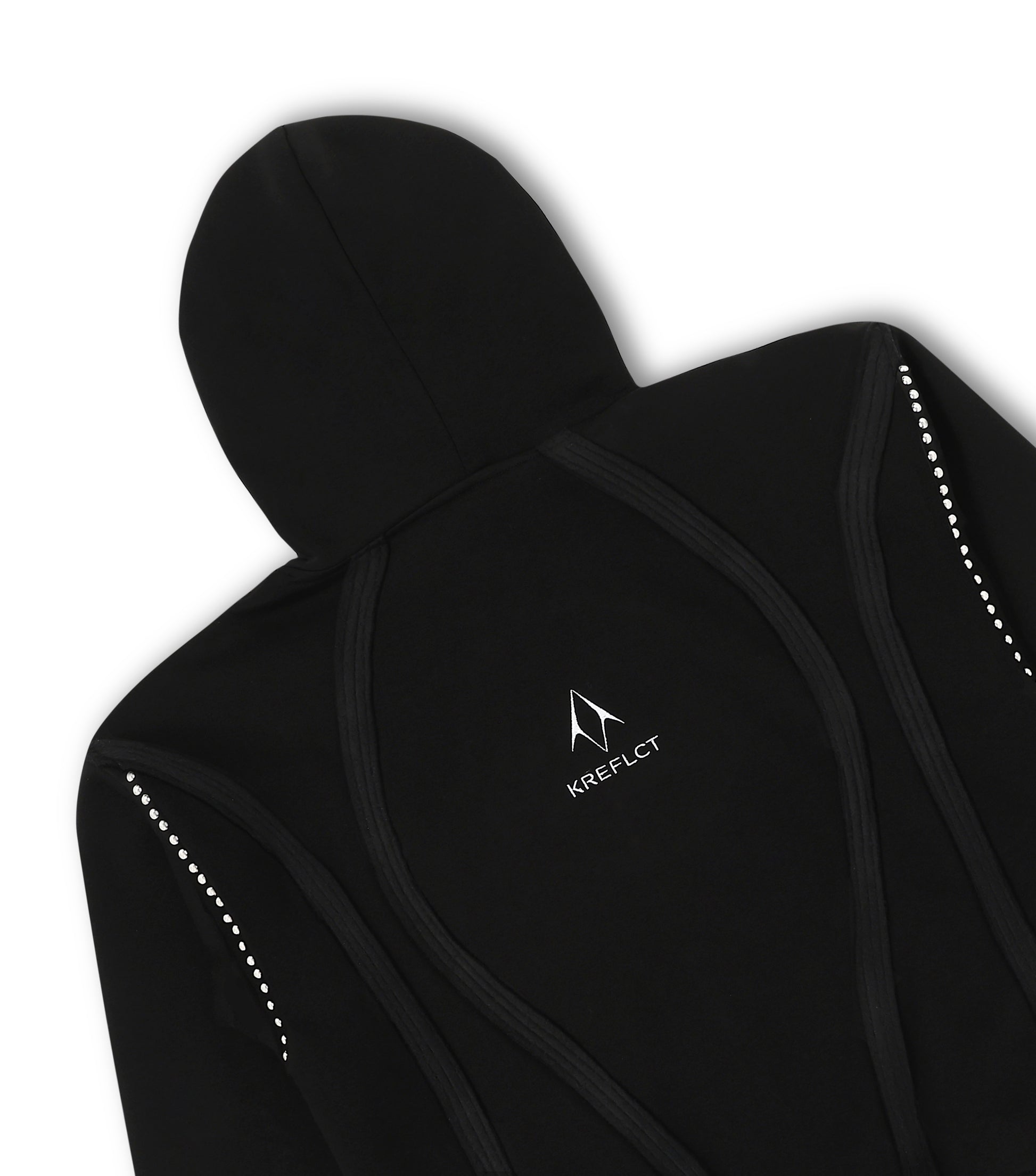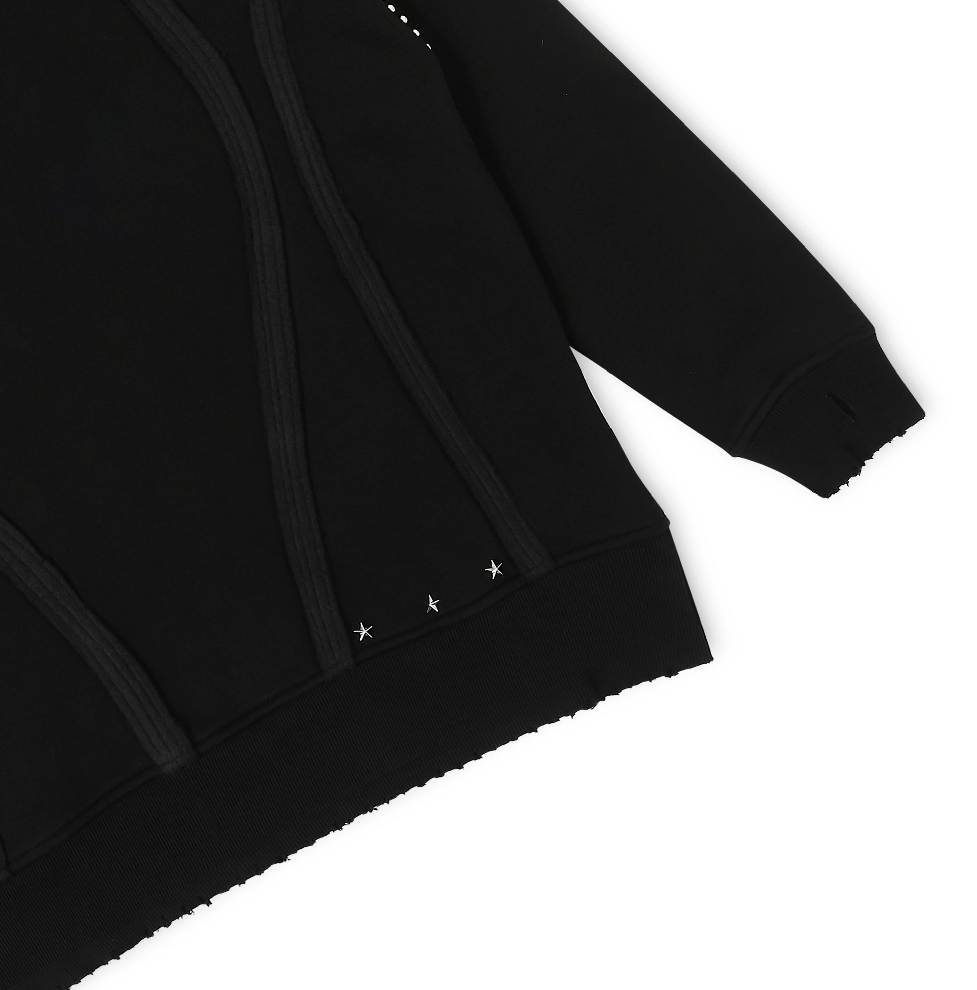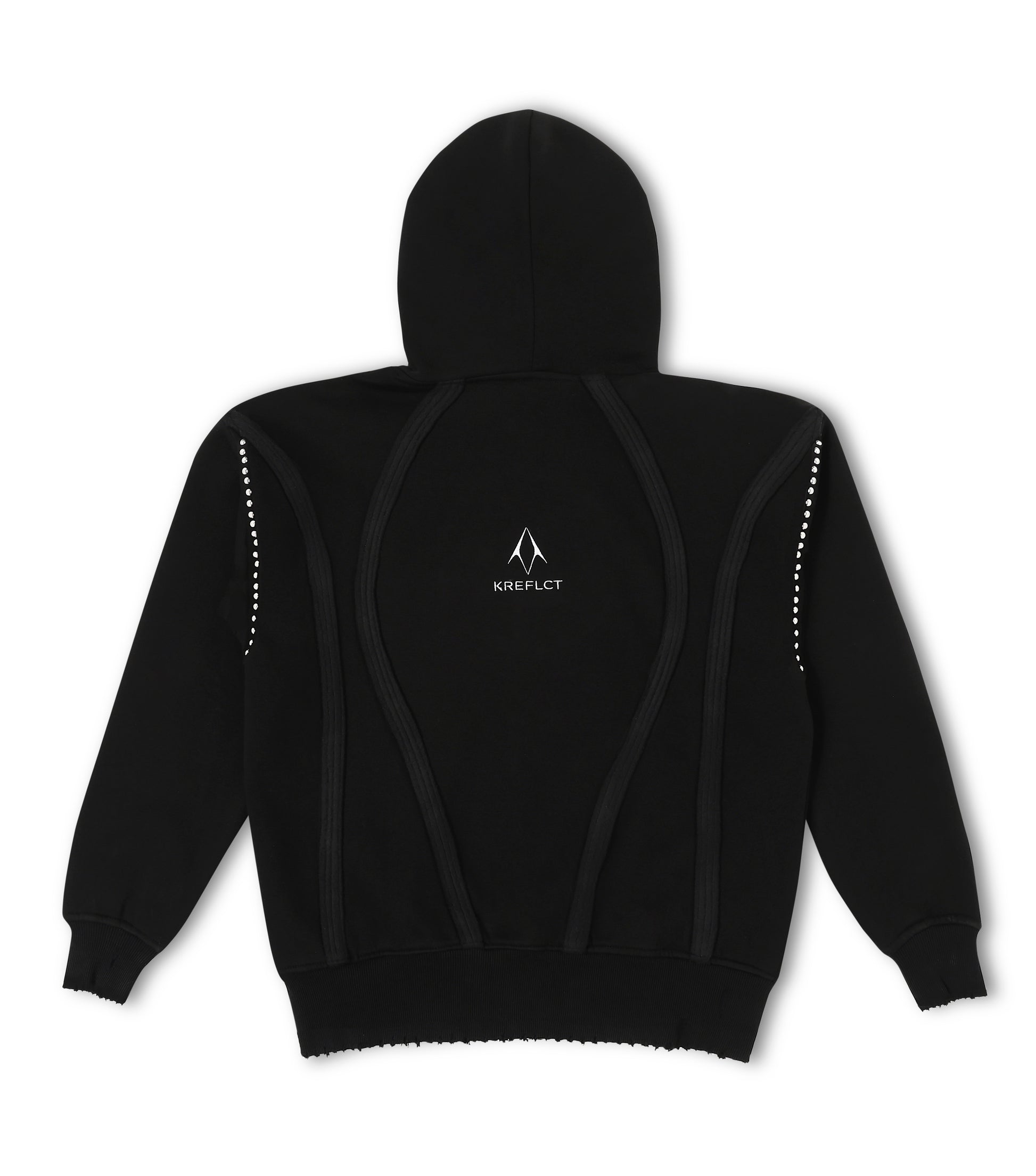 Kreflct’s Disrupt Noir Hoodie, a piece built to stand out through sharp detailing and clean structure. Metal rivets along the shoulders add a distinct highlight, while star-shaped rivets at the hem bring in a subtle signature touch. Inside-out curved panels run along the body, giving the hoodie a sculpted, dimensional look without being loud. The rugged, raw-cut bottom adds a lived-in finish that keeps things effortless. Made from heavyweight cotton terry with a soft fleece interior, it keeps you warm and comfortable all day. Pair it with cargos, denim, or your go-to black essentials, this hoodie makes an impact without trying too hard.