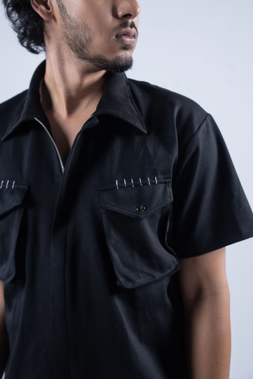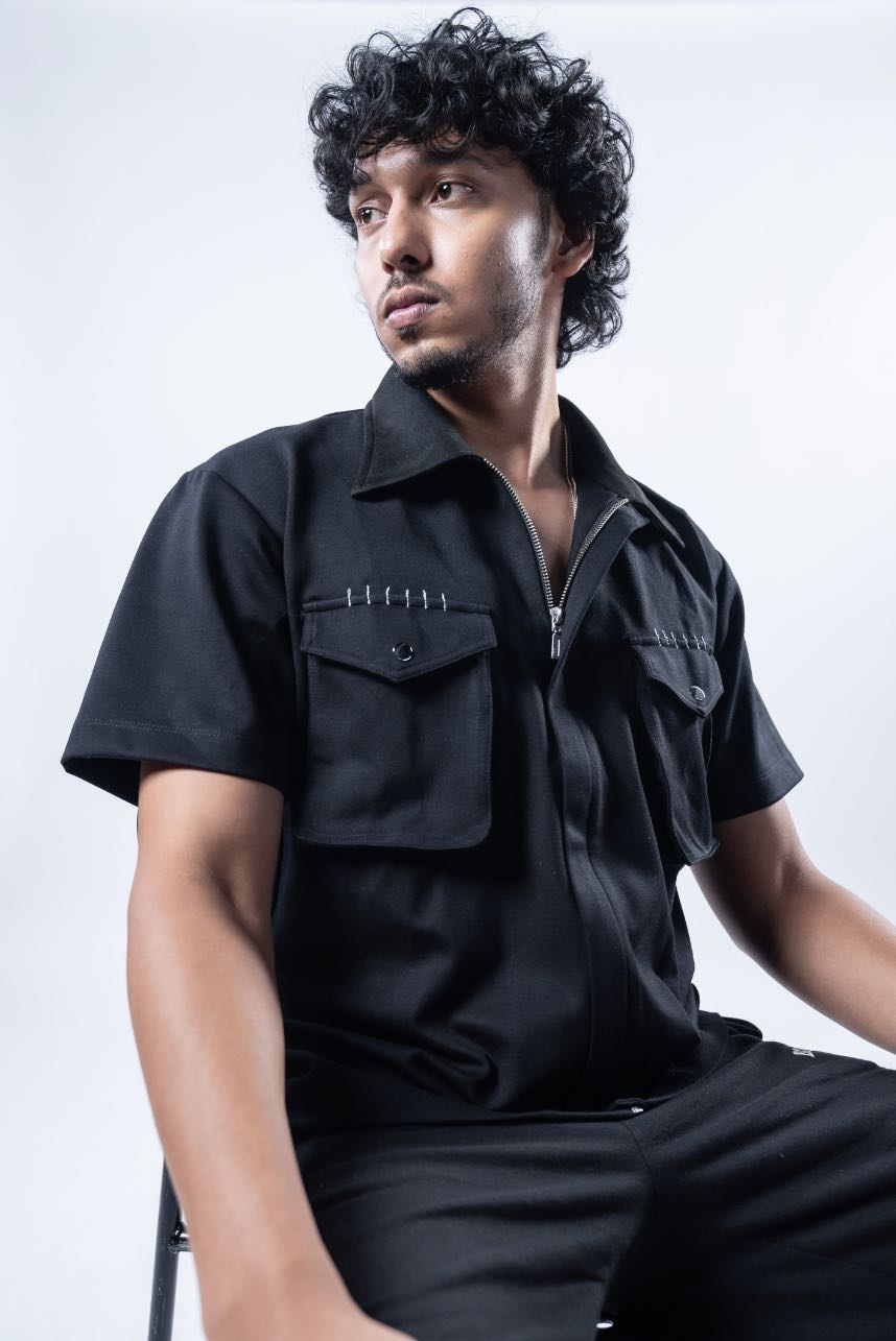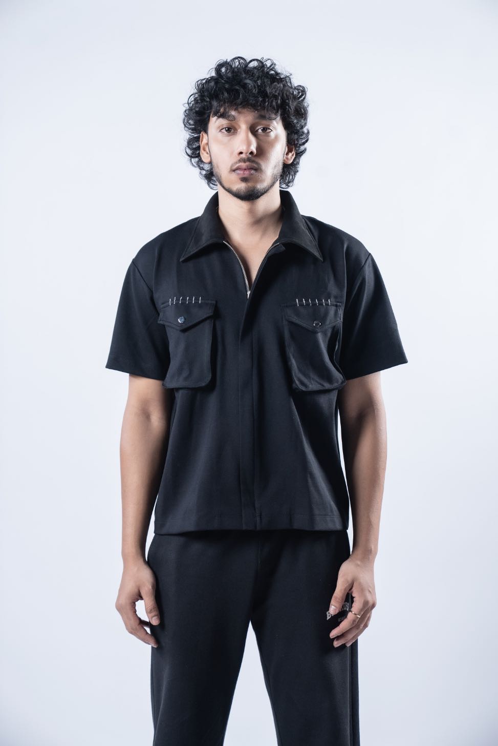 This shirt jacket features a soft, structured fabric with a clean zip-up front. The contrast vegan suede collar adds texture, and the front cargo-style pockets complete the look. On the back, signature logo embroidery keeps the branding sharp but subtle. Easy to wear solo or layered - it fits right in, no matter the plan.